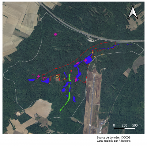 Les habitats forestiers sont largement majoritaires et représentent 97 % de la surface du site. 3 habitats d’intérêt communautaire y sont identifiés sur une surface assez restreinte. Les chênaies pédonculées des sols humides sont dominantes mais les habitats les plus remarquables sont les aulnaies tourbeuses, l’aulnaie - frênaie en bord du ru de la Biche et la boulaie à sphaigne.